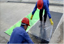 抬鋪法: 把已剪好的卷材反鋪于基面上(即是底部隔離紙朝上),待剝去卷材全部隔離紙后,再將水泥素漿刮涂在卷材粘結面和基面待鋪位置,然后分別由兩人從卷材的兩端配合抬起,翻轉和鋪貼在待鋪位置上。卷材與相鄰卷材之間為平行搭接,待長、短邊搭接施工時再揭除上下卷材搭接隔離膜。